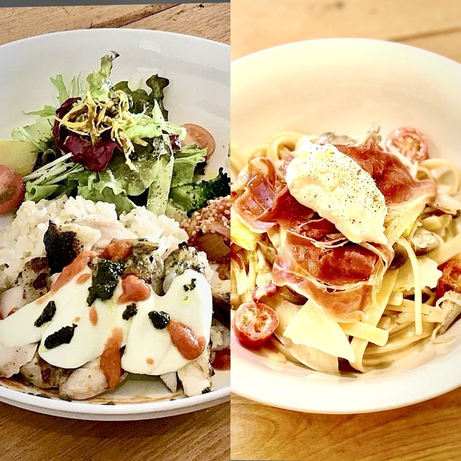 プレートランチのメインは、塩麹に寝かせた**越の鶏**をイタリア産水牛モッツァレラチーズと焼き上げた、ジューシーなオーブン焼きです。赤いトマトと緑のバジルソースで仕上げました。